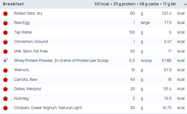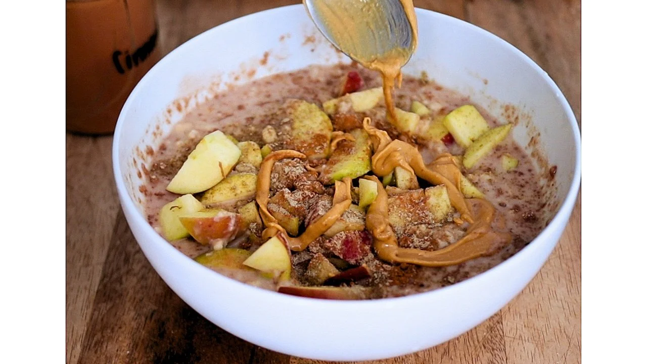 Mix milk (more or less based on your desired consistency) and protein powder, top with diced apple, peanut butter and spices.