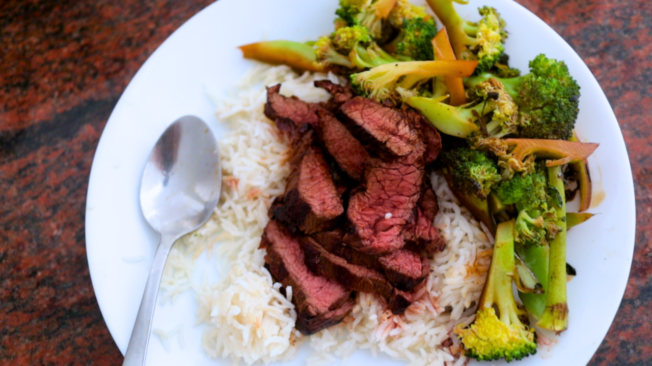 Slice Kangaroo and Serve on rice with broccoli.